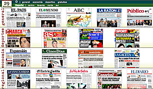 Hemos descubierto una página que sirve para esa finalidad, porque muestra todas las portadas de todos los periódicos digitales, de modo que se pueden ver y acceder a cualquiera de ellos y, además, se califican en nacionales e internacionales, por regiones, por secciones, separando Economía y Deportes, por ejemplo, almacenando incluso periódicos deportivos, económicos…en fin, que está bien