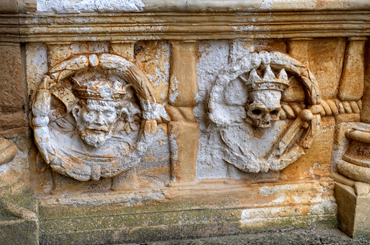 En una de las esquinas, también diseñada para pasar medianamente desapercibida para profanos, esculpida en la piedra de un rosetón de los muchos que circundan el porche, vi con claridad meridiana una calavera coronada. Es decir, una corona viva, símbolo de la materia, del poder terrenal, sobre una calavera, símbolo de la muerte, de la trascendencia. ¿Qué significa?. Creo que cualquiera de vosotros está en condiciones de averiguarlo, aunque solo sea porque, como sabéis, el lenguaje simbólico se caracteriza por entablar un diálogo subjetivo entre el símbolo y el observador, de modo que el símbolo habla a quien sabe hacerle hablar..Así son las cosas raras de este mundo del simbolismo.