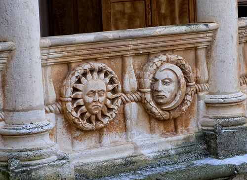 ¿Qué hacen ahí el sol y la luna como una pareja de enamorados (nunca mejor dicho) ilustrando el principio de la complementariedad de los opuestos?. No pegan ni con cola al lado de tanta cabeza que imagino ortodoxa a la vista de los sombreros que les adornan. ¿O si pegan y lo que no pega es nuestra ignorancia?. Pues muy claro: quienes construyeron el edificio, quienes tallaron las piedras, canteros de profesión y dicen que antecesores de los masones especulativos (a esos que trabajan la piedra les llamaban operativos) quisieron dejar su huella y pensaron que al fin y al cabo nadie se iba a dar cuenta del detalle, porque la ignorancia suele ser muy atrevida, tanto que es la base de la arrogancia, porque cada vez que me encuentro con alguien arrogante suele coincidir con una dosis de ignorancia que si no es enciclopédica, poco, muy poco le falta para merecer el atributo. Supongo yo que pensaron que tal vez algún día alguien se diera cuenta y lo contara. Pues acertaron, al menos conmigo, porque yo me he dado cuenta y lo estoy contando. Seguro que antes lo han hecho otros; pero ahora es mi turno al escribirlo y el vuestro, si queréis, el leerlo y enteraros.