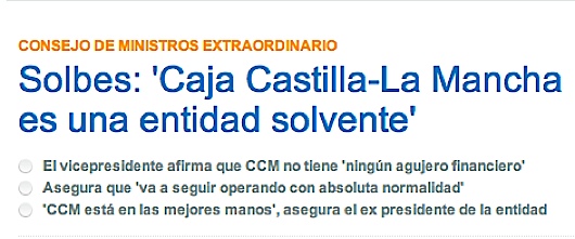 Antes que el de J Cacho leí lo redactado por JGenova, comentando un comunicado oficial de la Caja CM que parece haber resultado negado por los hechos. Finalmente el Banco de España intervenía. Era algo que el mercado reclamaba a gritos. No ha existido sorpresa. Al menos no en la decisión, aunque quizás sí en la tardanza. Algunos aseguran que Hernández Moltó, el Presidente, es el motivo sustancial del modo y manera en que se ha tratado este asunto. Otros creen que se trata de algo mas arriba, apuntando a José Bono. En todo caso el PSOE se encuentra comprometido con activos personales en el desperfecto. ¿Es posible que se hayan cuidado mas los intereses políticos del partido en el Gobierno que la verdadera situación financiera de la entidad y el mercado? ¿Es posible que los intereses políticos hayan primado sobre los propios declientes y depositantes? ¿Es posible que el deseo de preservar el poder haya prevalecido sobre la transparencia financiera? Pues es posible…