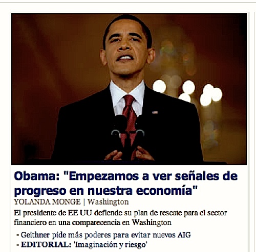 No se qué sucede realmente con Obama. Como habéis comprobado he querido ser prudente en abstenerme de opinar. Y sigo sin opinar. Sólo digo que no se muy bien lo que sucede, aunque comienzo a imaginar lo que ocurre por el trasfondo de la economía americana. Mejor dicho, de la política americana, y, con ella y a través de ella, con la mundial. Por ejemplo: el plan que presenta para el sector financiero. Ya van algunos pocos de planes, como dicen por el Sur. Y las cantidades inyectadas son ingentes. Bueno, ingente es palabra que la realidad convierte en corta cada día. Ahora uno nuevo de un billón de dólares o no se cuanto mas. Y funciona de un modo singular porque dicen que apela al dinero del sector privado. A mi me da que el dinero privado no se dedica a comprar activos malos ni con la Guardia Civil, o su equivalente, si lo hay, en USA. Una cosa son los sobresueldos de los ejecutivos y otra los dineros de los propietarios….
