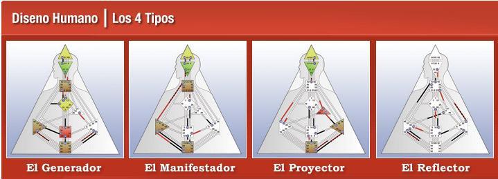 Según el D.H. en la humanidad hay cuatro tipos de personas, los Generadores, que son los que generan el trabajo, la actividad, y que son el 70% de la población. Su estrategia es la de Responder, cuando se les pregunta, o se les pide algo, para así evitar la frustración, y encontrar la satisfacción. Están aquí para conocerse a sí mismos. Los Proyectores, que son alrededor del 20% de la población, estos no son tipos energéticos, y no tratan de atraer la atención, ni de atraer cosas hacia ellos, solo esperan que los reconozcan. El don del proyector es su habilidad para organizar a los tipos energéticos. Su estrategia es esperar a la invitación para encontrar el éxito, y evitar la amargura. Los Manifestadores, estos se manifiestan por medio de diferentes formas de expresarse, se les distingue porque tienen un centro motor conectado a las garganta, son alrededor del 9% de la población. Tienen como estrategia informar antes de actuar, para encontrar la paz y evitar la rabia. Están aquí para entender el impacto que tienen sobre los demás. Y finalmente los Reflectores que son alrededor del 1%, para mí son el tipo más curioso, pues no tienen nada definido en su carta, y tampoco tienen autoridad interna. Están aquí escaneando todo y recogiendo muestreos de todas las personas, para reconocer quien es diferente.